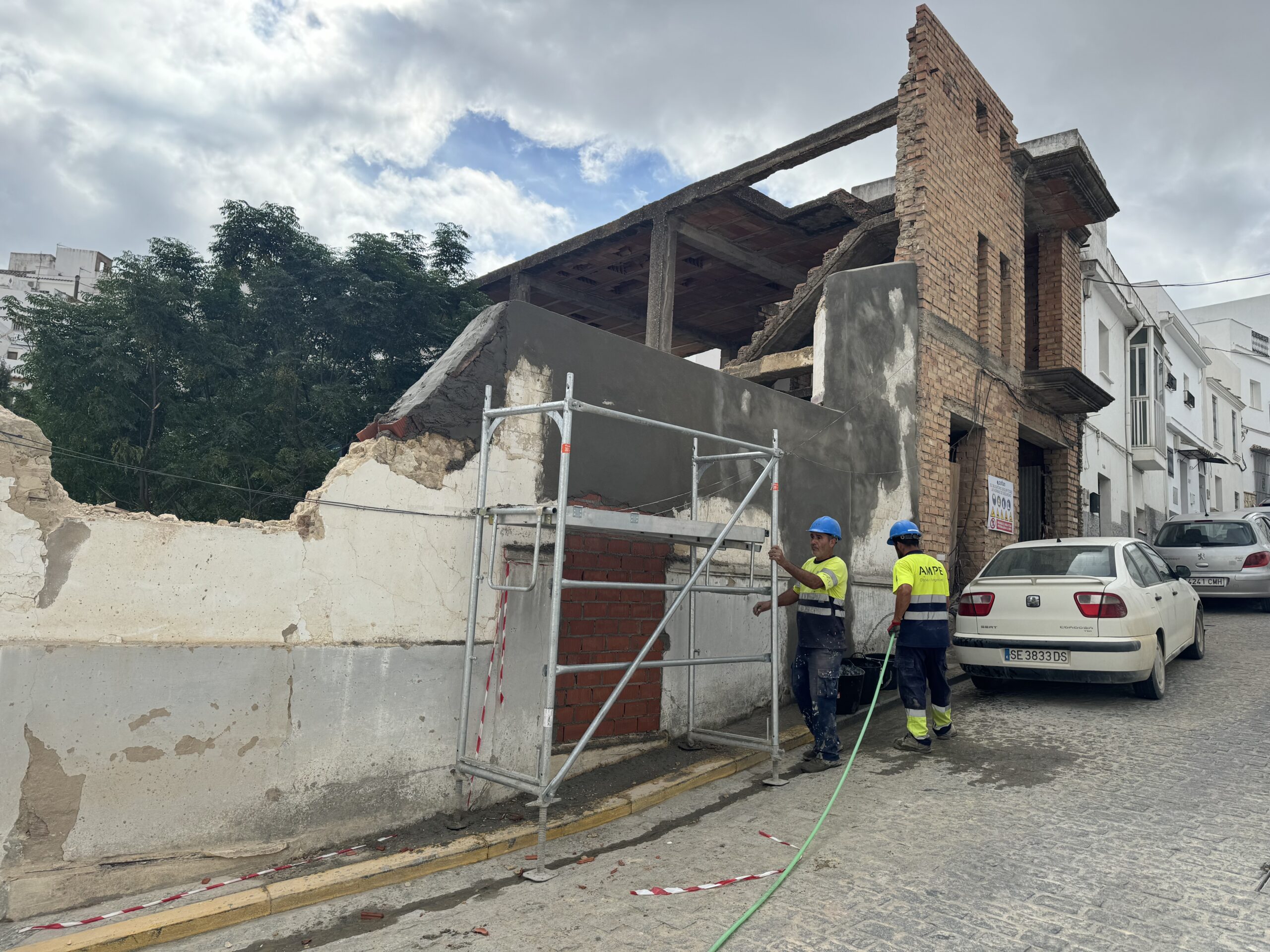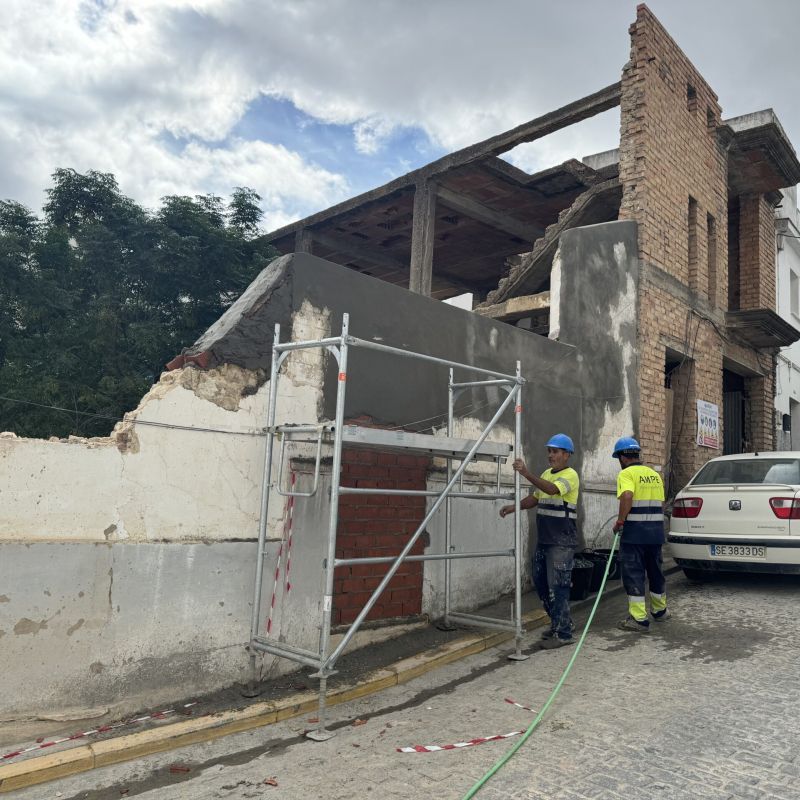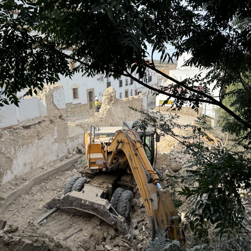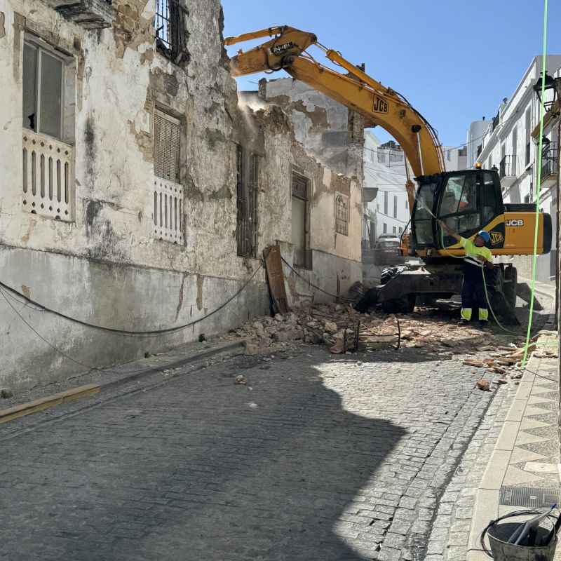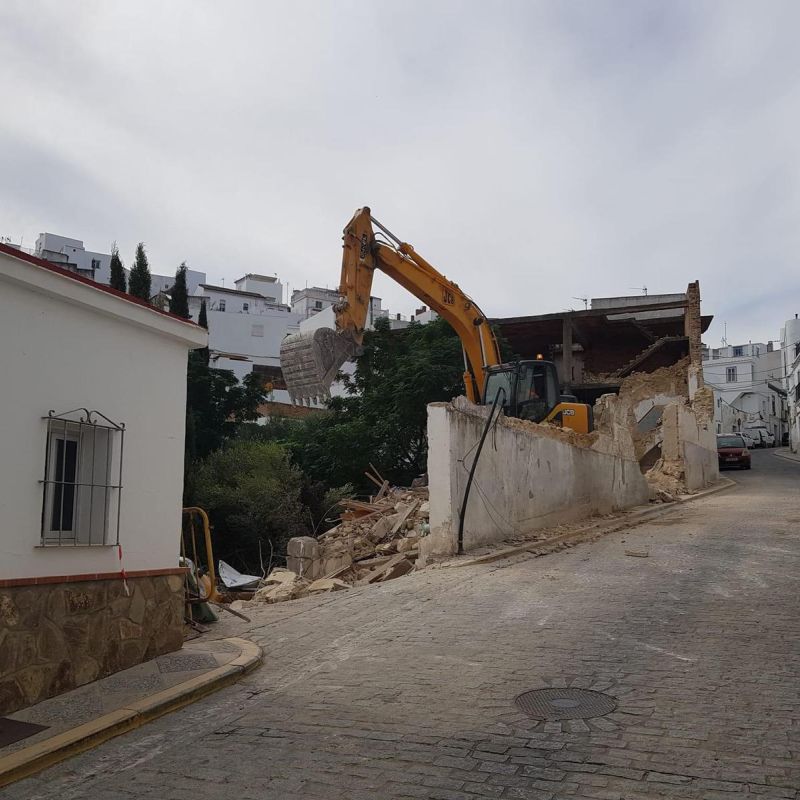 AMPE Obras e Ingeniería ejecuta la demolición controlada de lo que en su día fue un hostal en Alcalá de los Gazules (Cádiz) tras declaración de ruina inminente. Seguridad, rapidez y gestión de residuos eficiente.